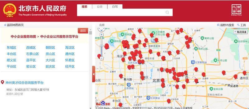 企业相关人员输入网址https://map.beijing.gov.cn/,在页面左侧一栏找到“中小企业服务”版块,便点击进入了服务地图。该地图覆盖北京市各区(含北京经济技术开发区),共整合了175家中小企业公共服务示范平台(简称“示范平台”)和109家小型微型企业创业创新示范基地(简称“示范基地”)。这些示范平台和示范基地作为中小企业公共服务体系核心载体,致力于集聚各类资源要素,助力小微企业成长壮大,具有“配套齐全、服务周到”特点,能为小微企业提供创业孵化、技术支持、市场推广等全链条服务。
